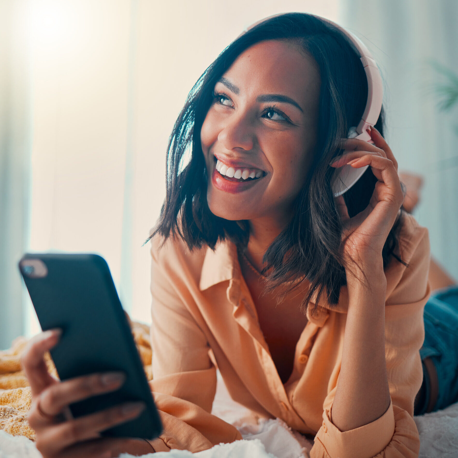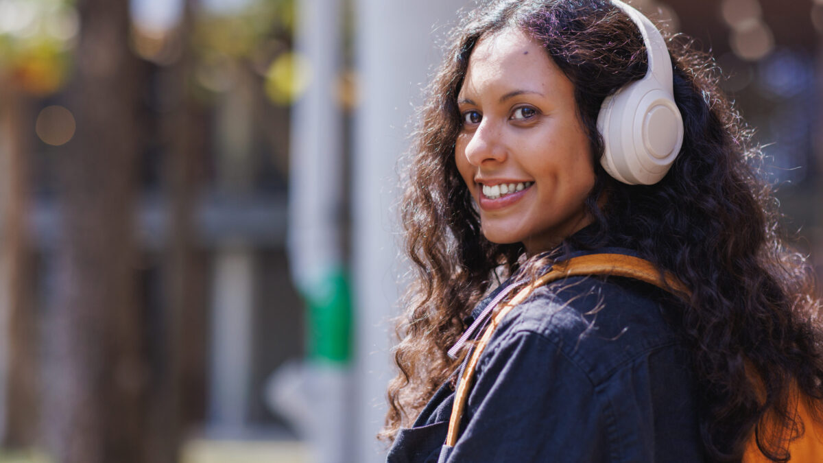 Young woman smiling, wearing wireless headphones and a backpack, enjoying music outdoors
