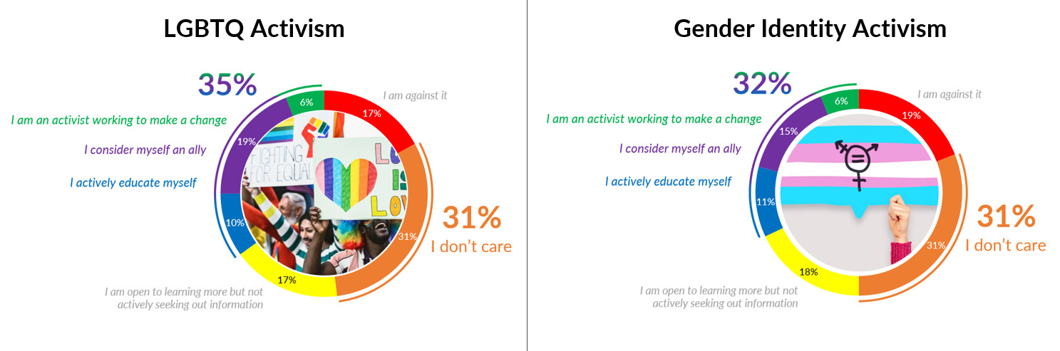 About 1 in 3 Americans are actively engaging in LGBTQ and/or gender identity topics, while another third “don’t care.”